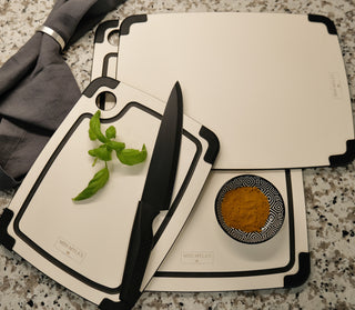 Our cutting boards are made from high-quality composite materials designed for durability, easy cleaning, and a sleek, modern look. They’re built to simplify food prep, speed up your cooking, and withstand heavy use, making them perfect for both beginner and experienced cooks. We are offering 3 of the most popular sizes: 11.8 x 9.3, 14.6 x 10.8 and 17.3 x 12.8.