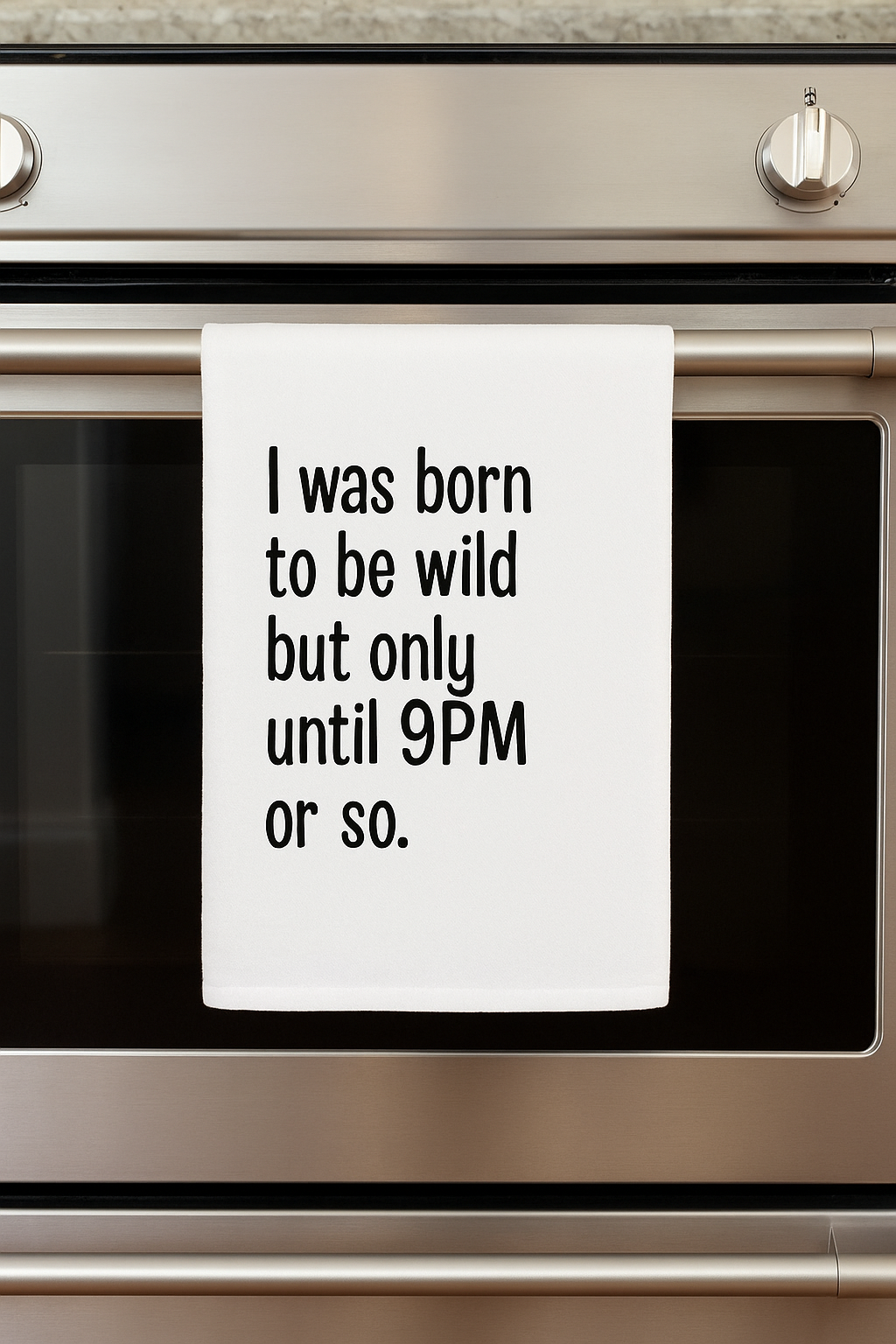 đïž Funny Tea Towel â "I Was Born to Be Wild But Only Until 9PM"